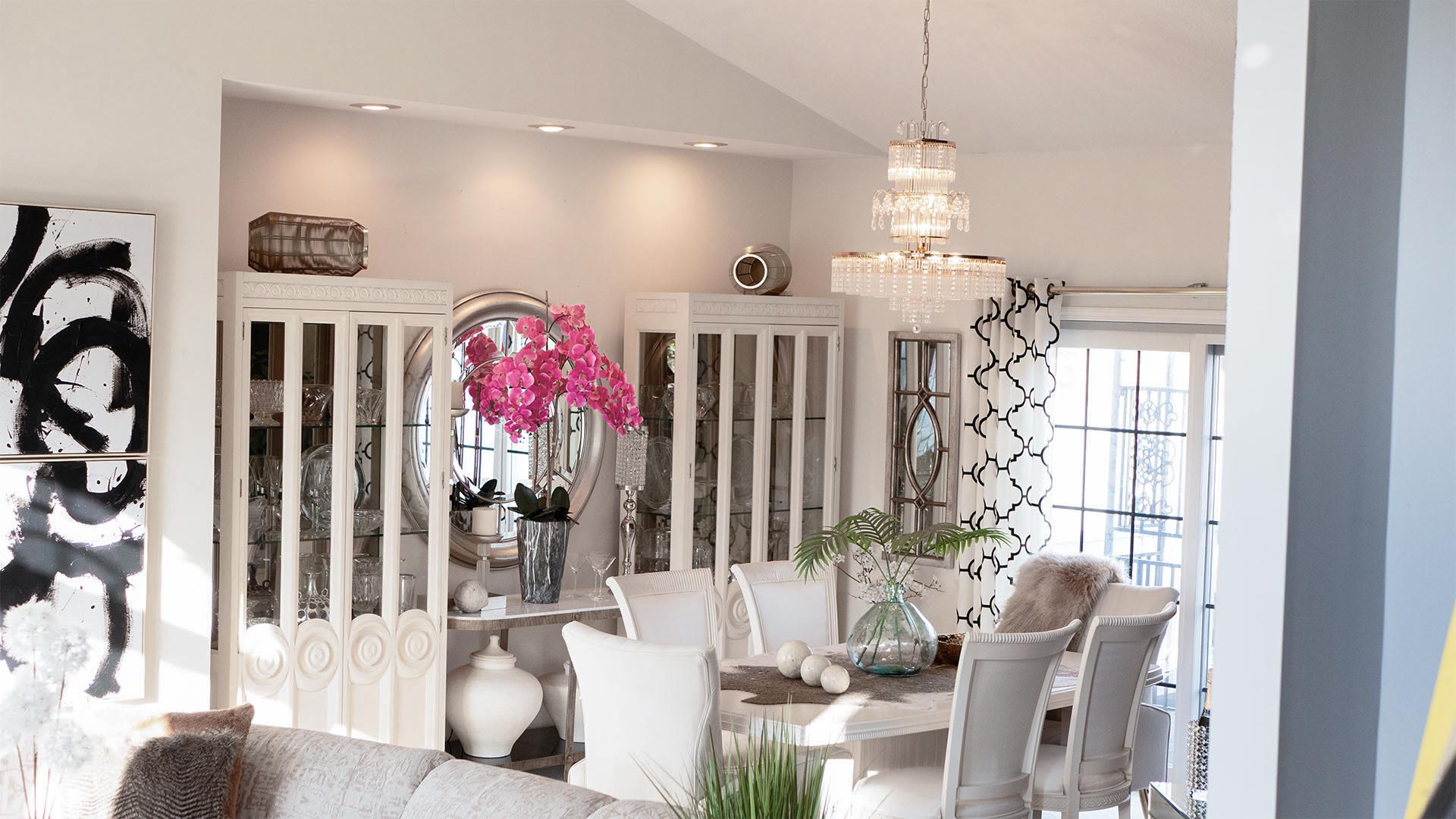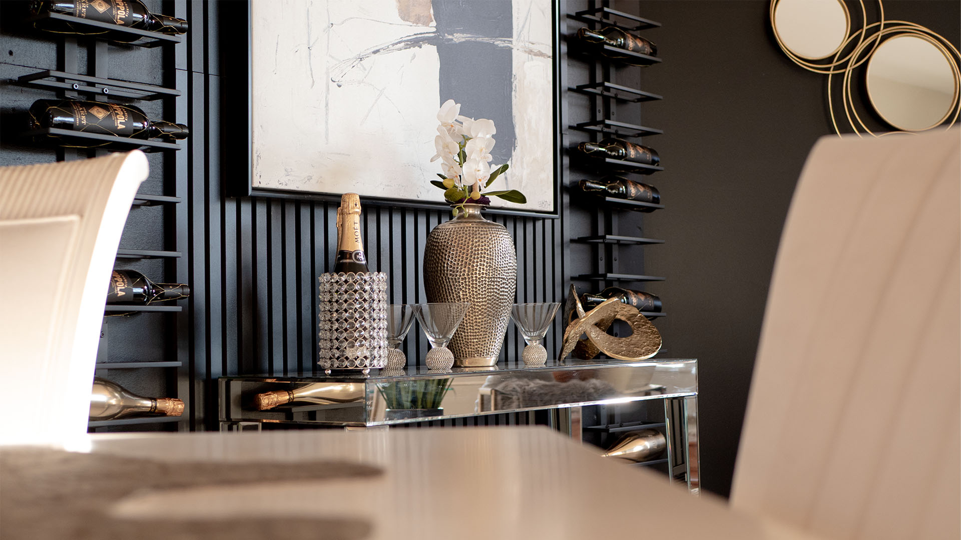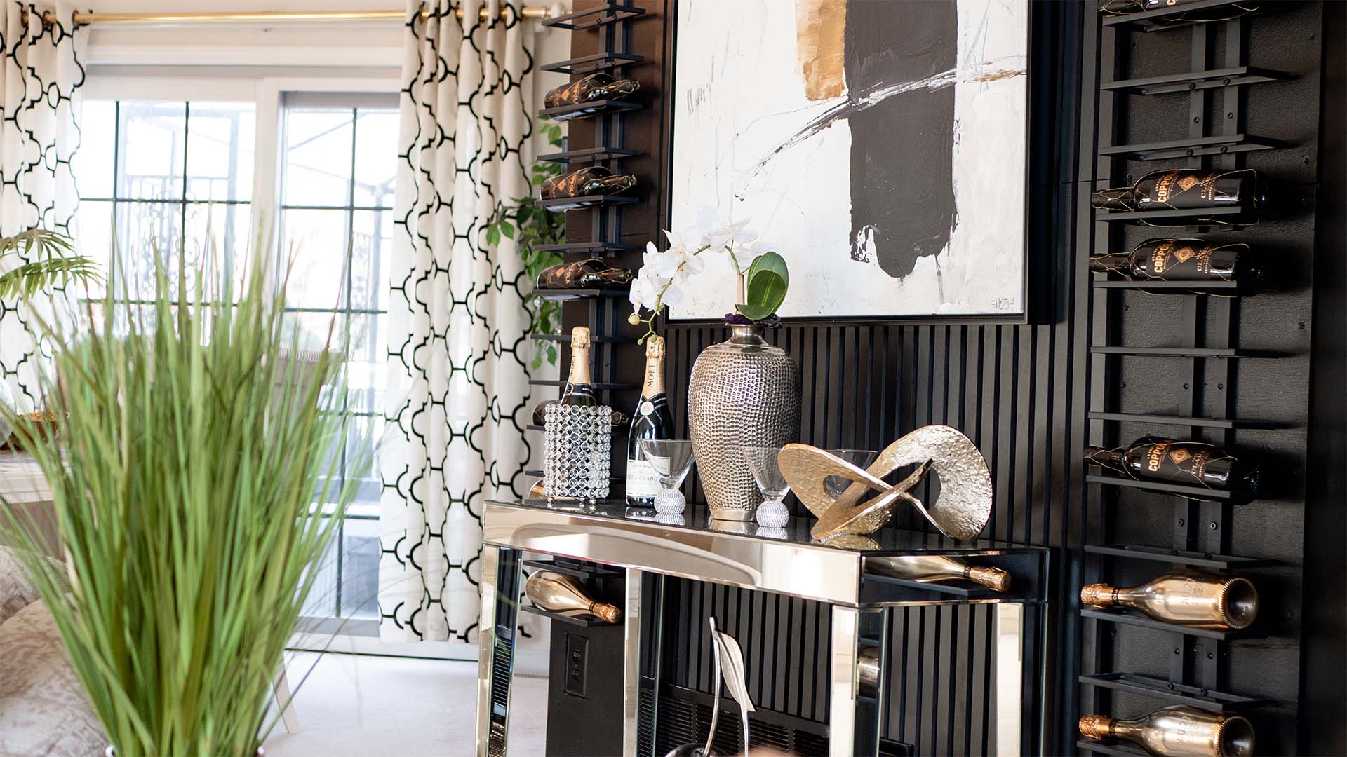 Step into a space where sophistication meets contemporary luxury. This stunning living room remodel features a floor-to-ceiling wine wall set against a bold black accent wall, creating a striking focal point. A gold chandelier with crystal accents adds warmth and opulence, beautifully complementing the crisp white walls. To complete the look, a black, white, and gold abstract painting brings artistry and balance to the design.